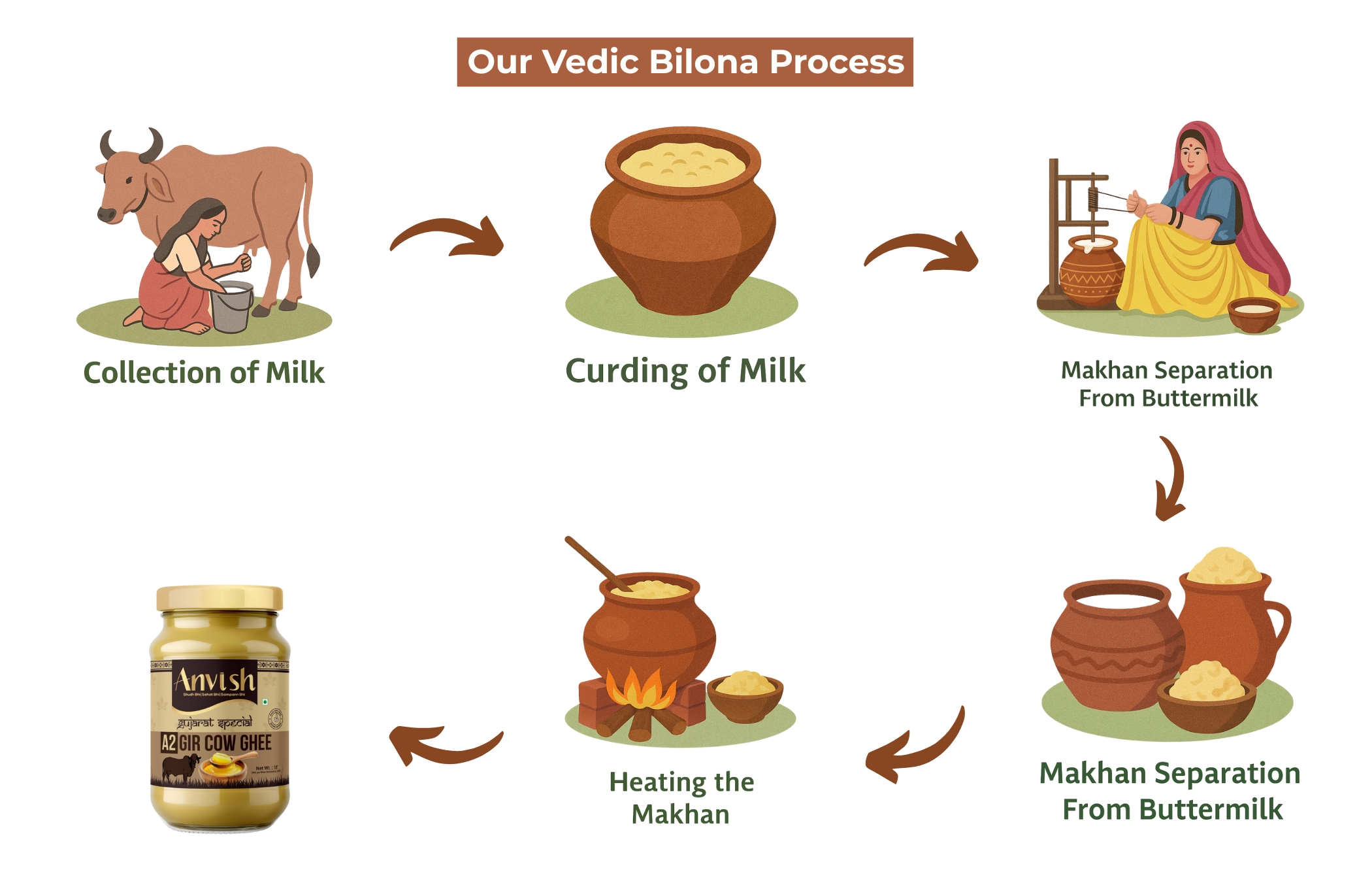 At Anvish Foods, we are deeply committed to purity, transparency, and tradition. Our journey begins with trusted farmer families who rear indigenous Gir cows in natural, ethical environments. We collect only A2 milk after rigorous quality testing, then craft our ghee using the age-old Bilona method, ensuring it retains all its natural goodness and rich flavor.
